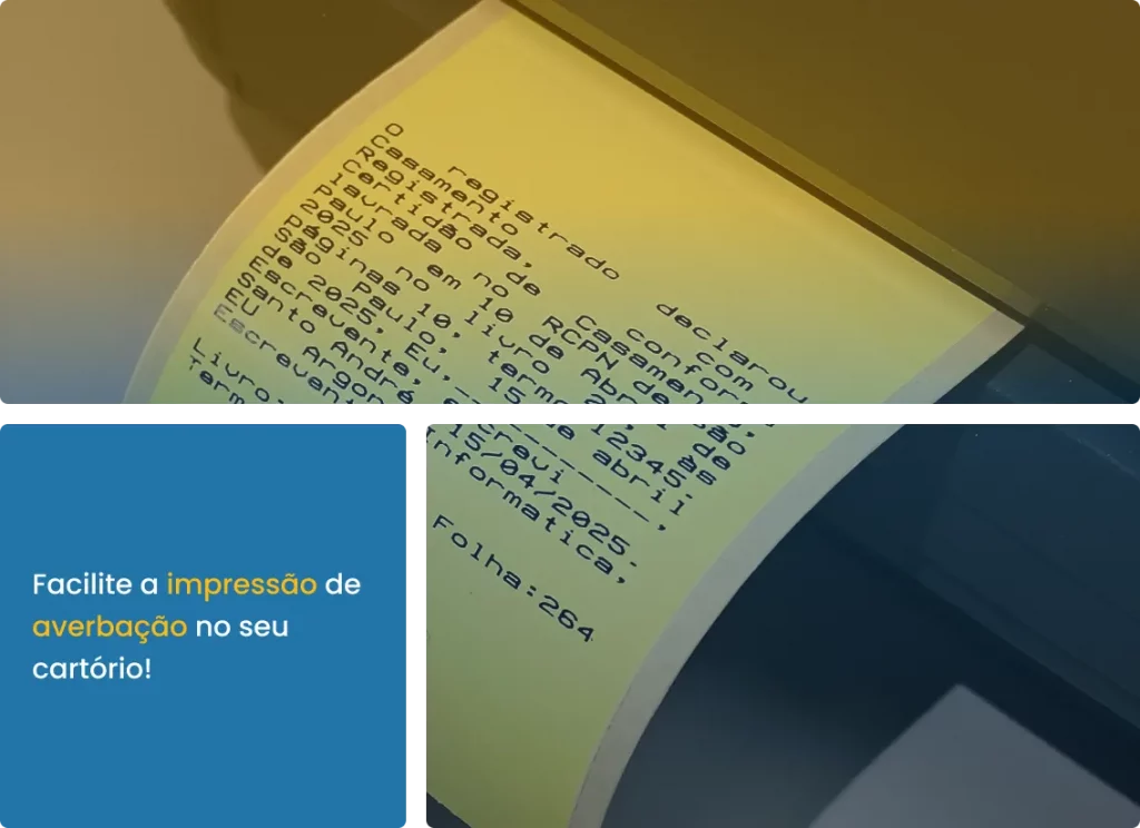 O AVERBAPRINT consiste na digitação de averbações e anotações, na impressão de qualidade com compactação em etiquetas adesivas extrafino e de alto desempenho de cola para serem colados à margem do livro.